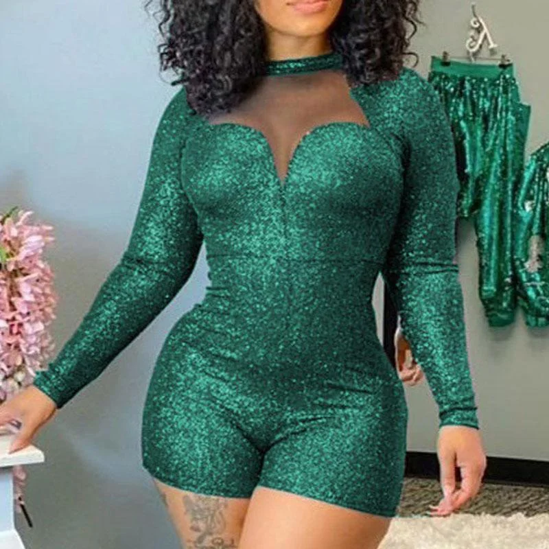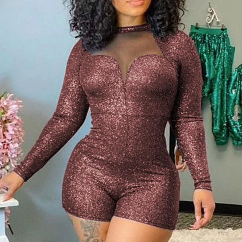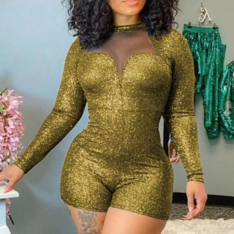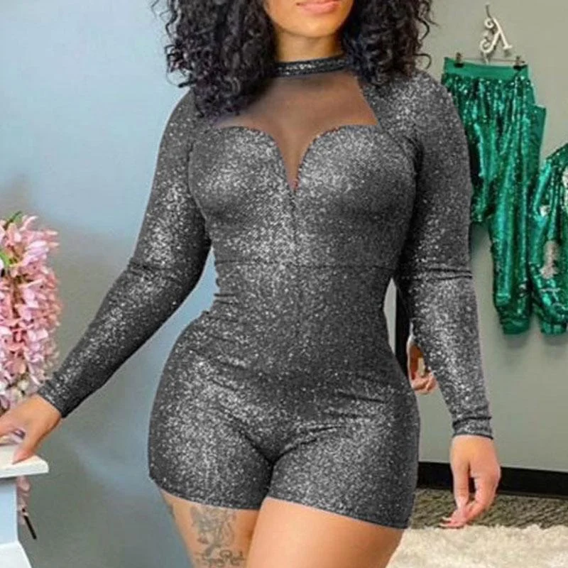 Glitter Long Sleeve Sheer Mesh Patchwork Romper