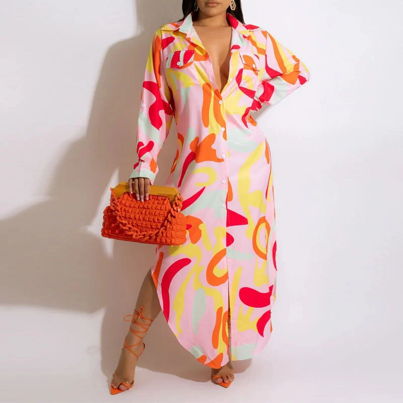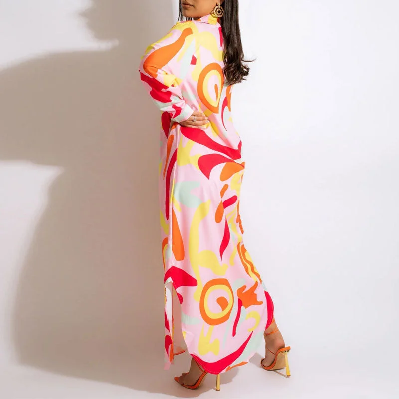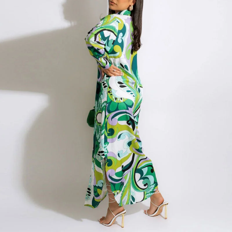 Print Long Sleeve Asymmetrical Maxi Shirt Dress