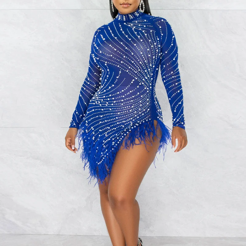 Rhinestone Beaded Long Sleeve Feather Design Slit Bodycon Dress