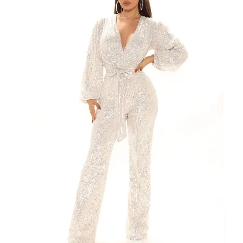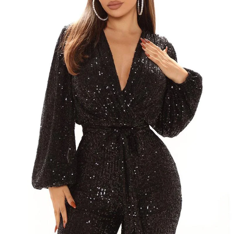 Sequins Deep V-Neck Long Sleeve Jumpsuit