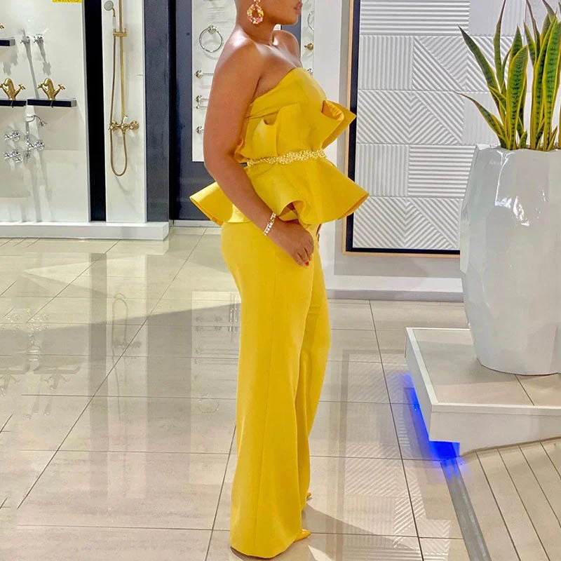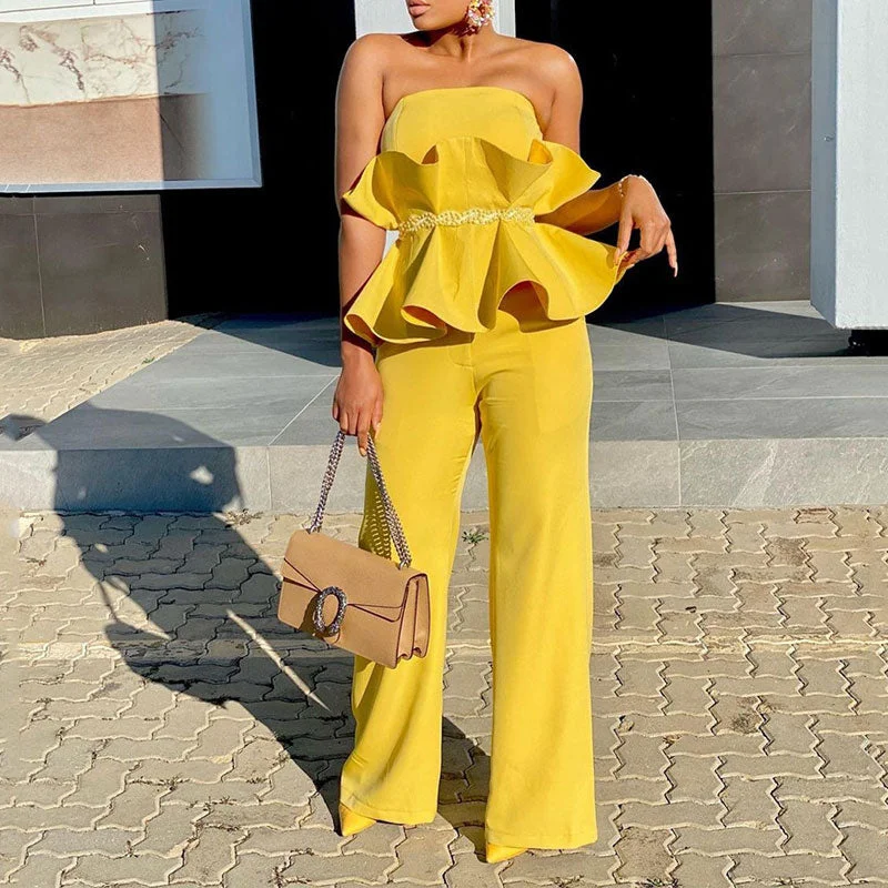Solid Bandeau Ruffle Design Wide Leg Jumpsuit
