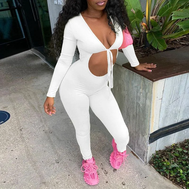 Solid Deep V-Neck Cut Out Tied Jumpsuit