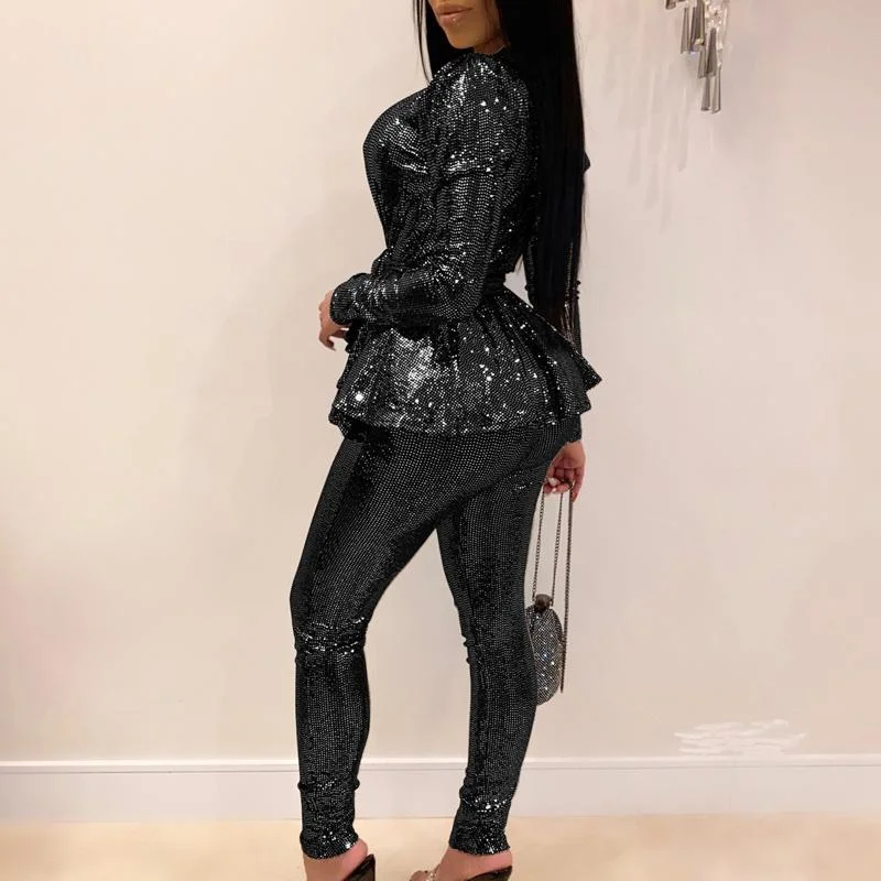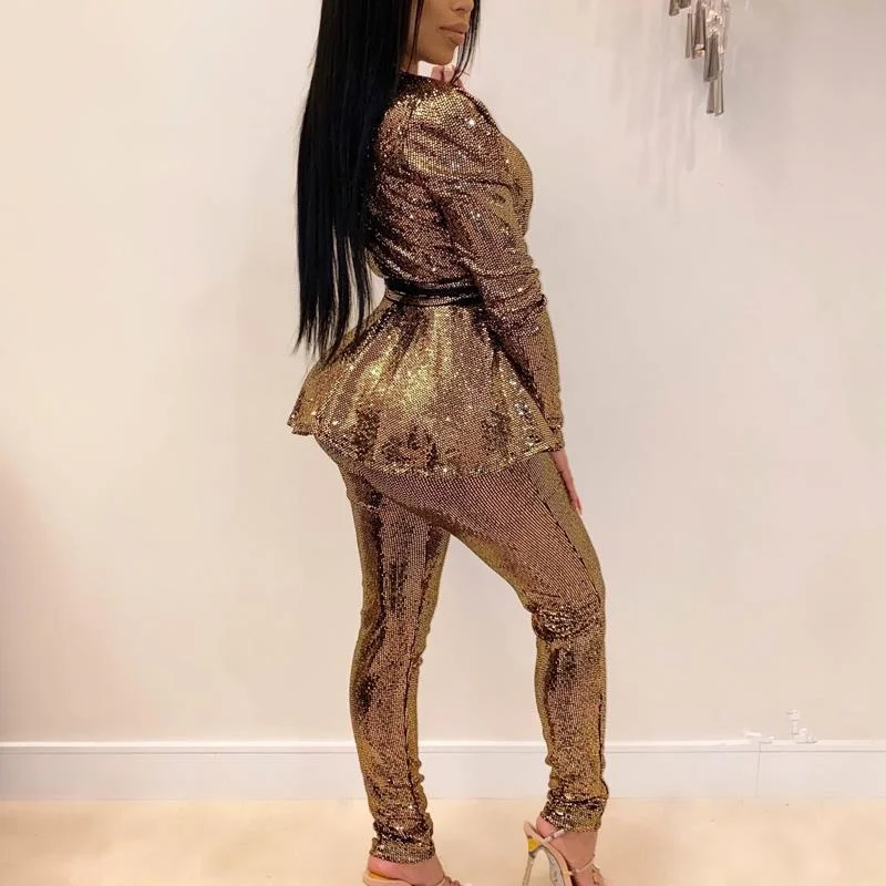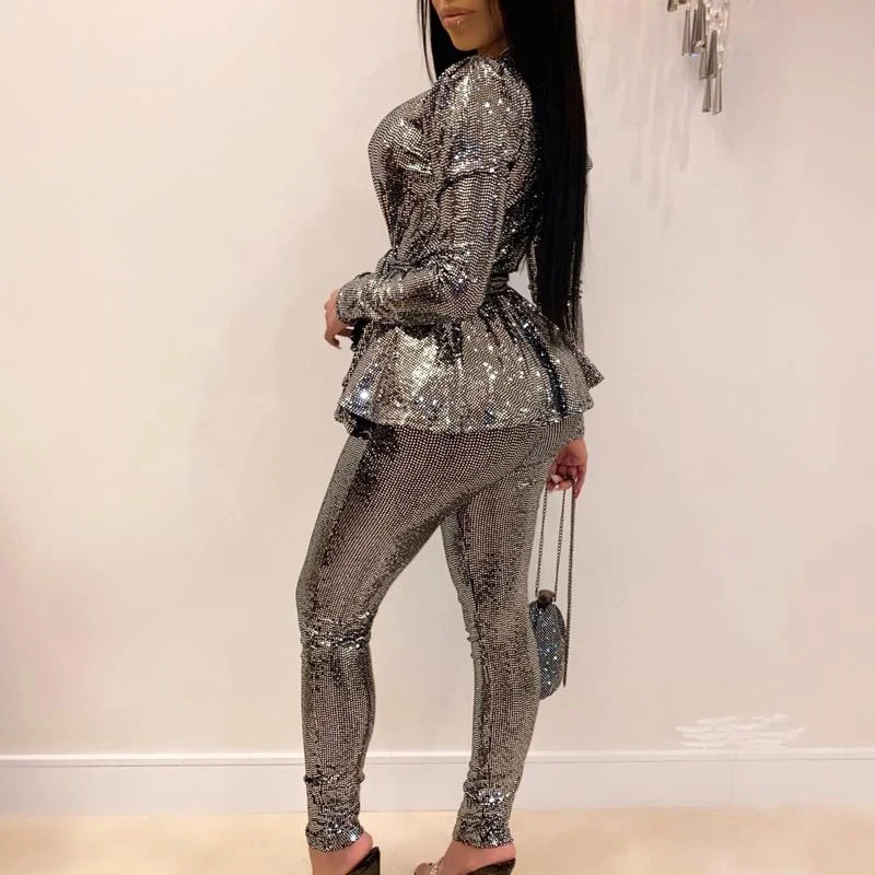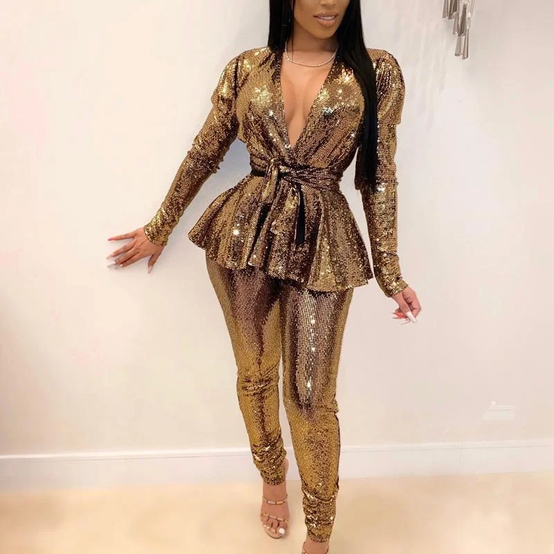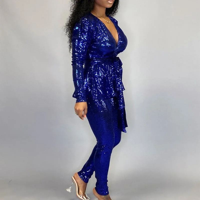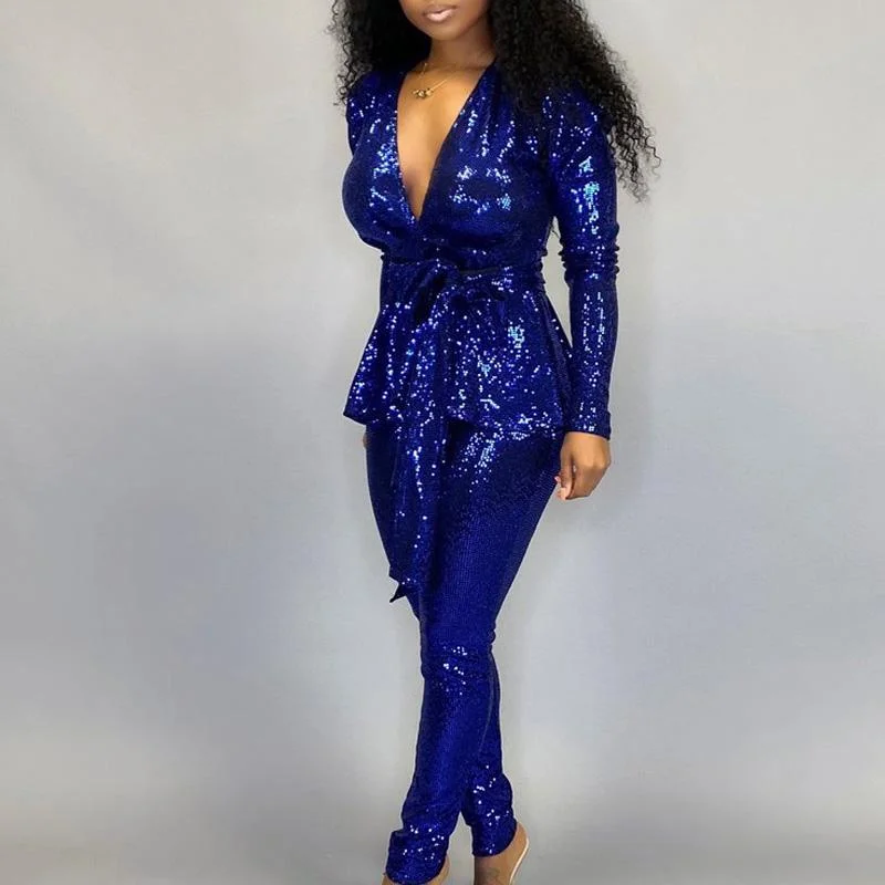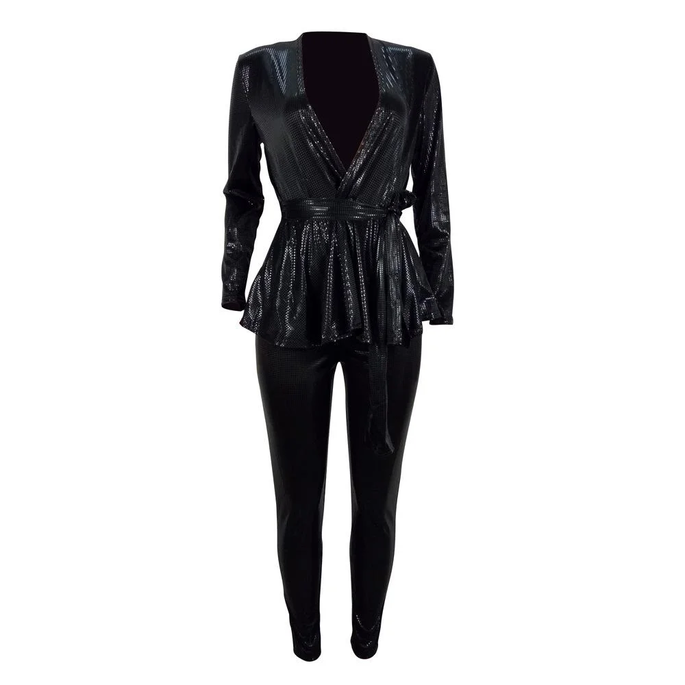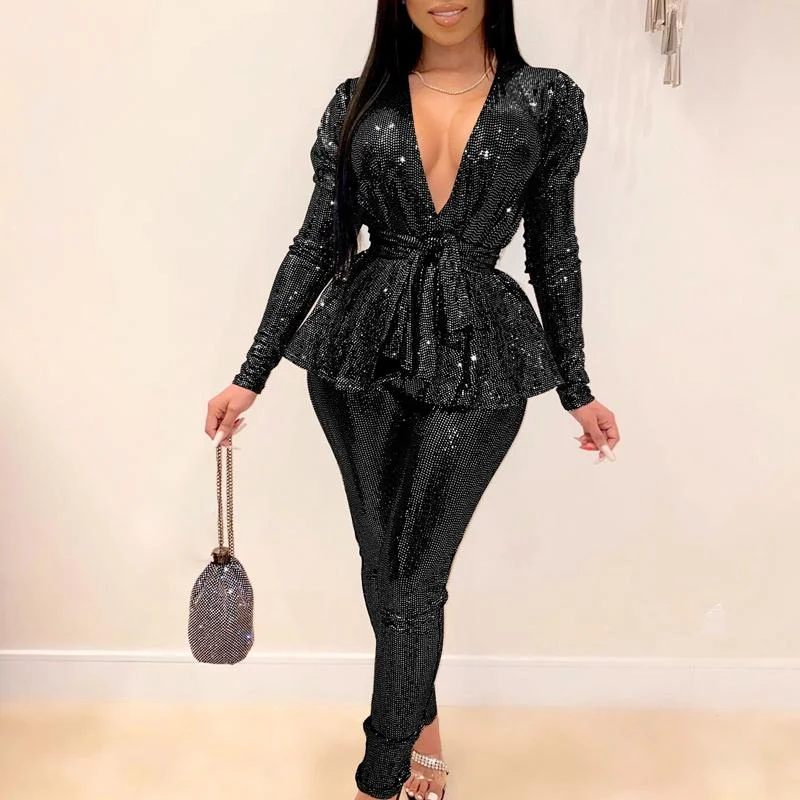 Solid Deep V-Neck Long Sleeve Two Piece Set With Belt