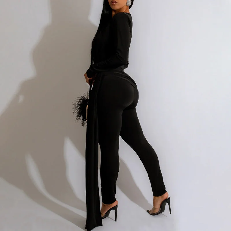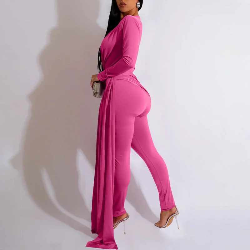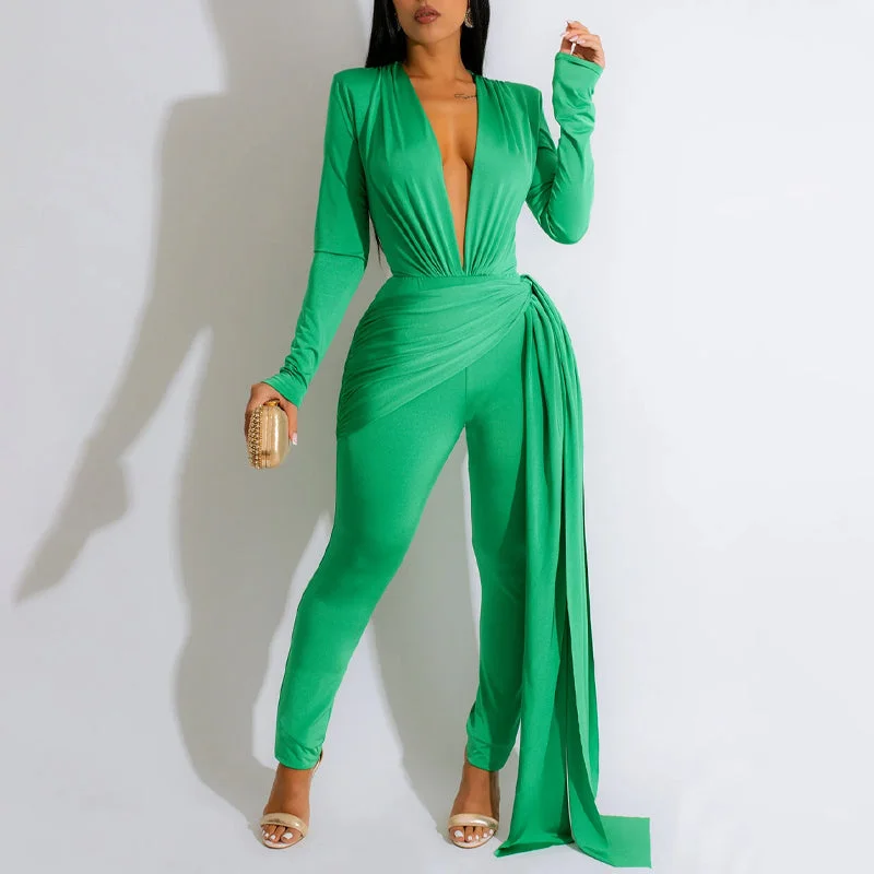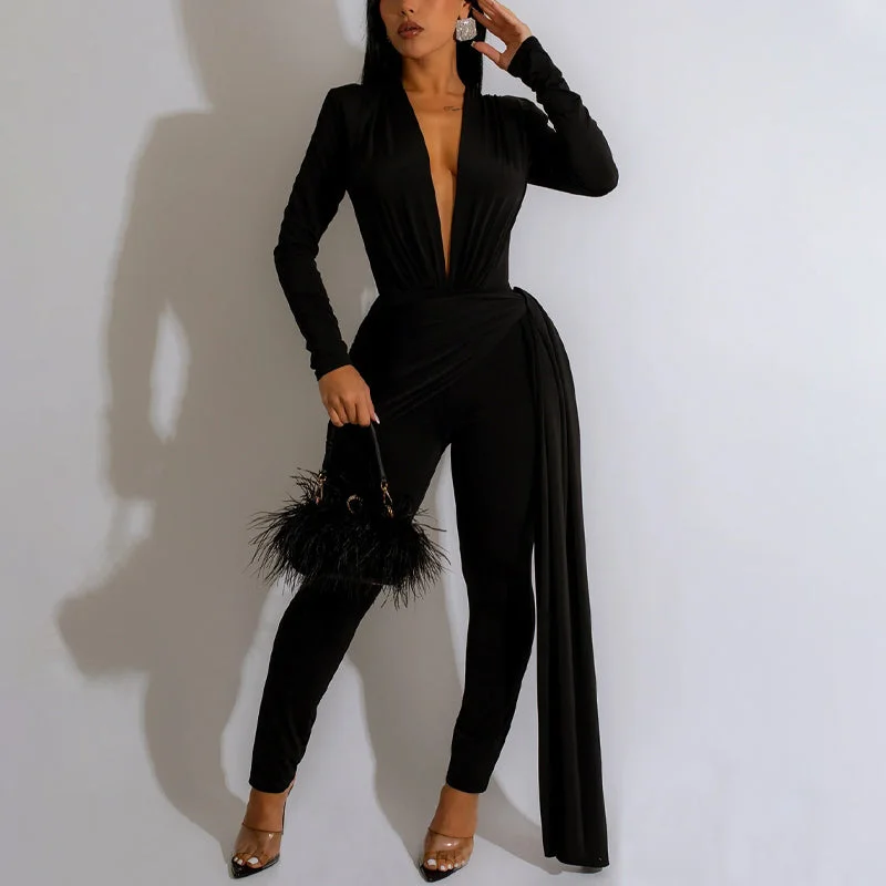 Solid Long Sleeve Deep V-Neck Train Jumpsuit