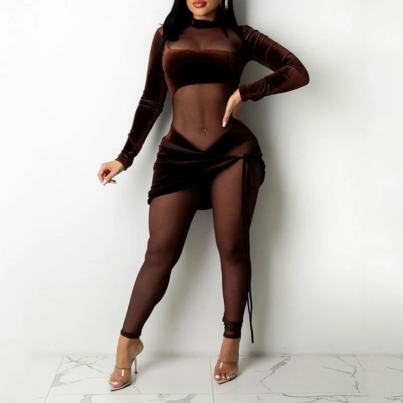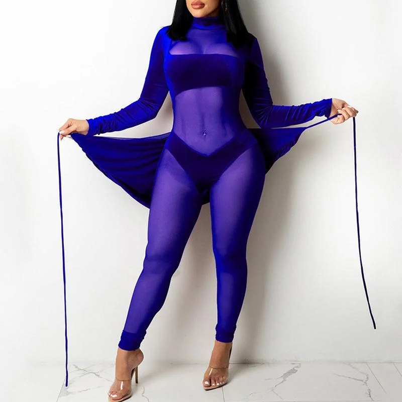 Solid Long Sleeve Sheer Mesh Patchwork 2PCS Jumpsuit