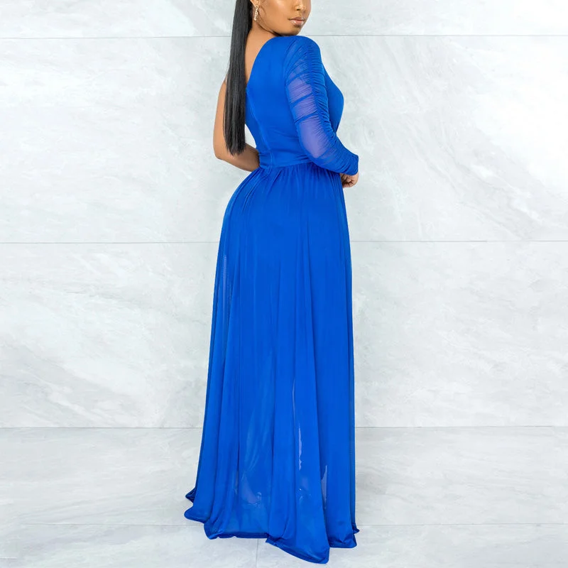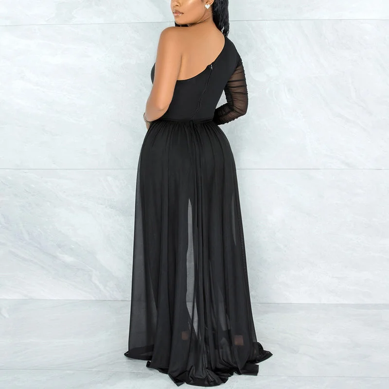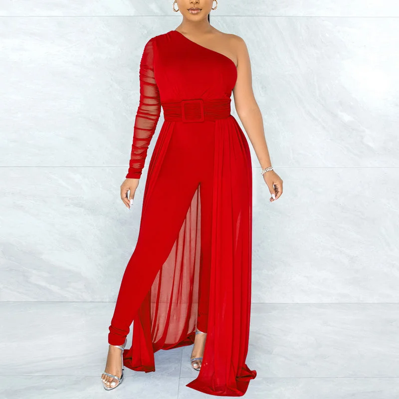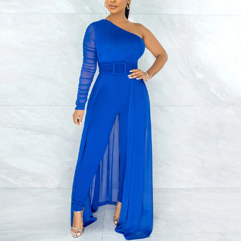 Solid Oblique Shoulder Mesh Patchwork Jumpsuit