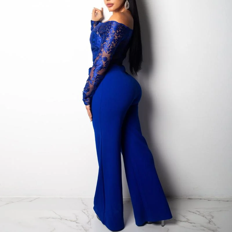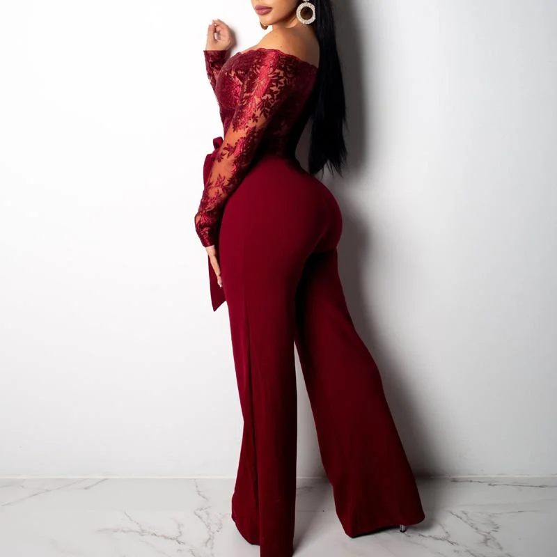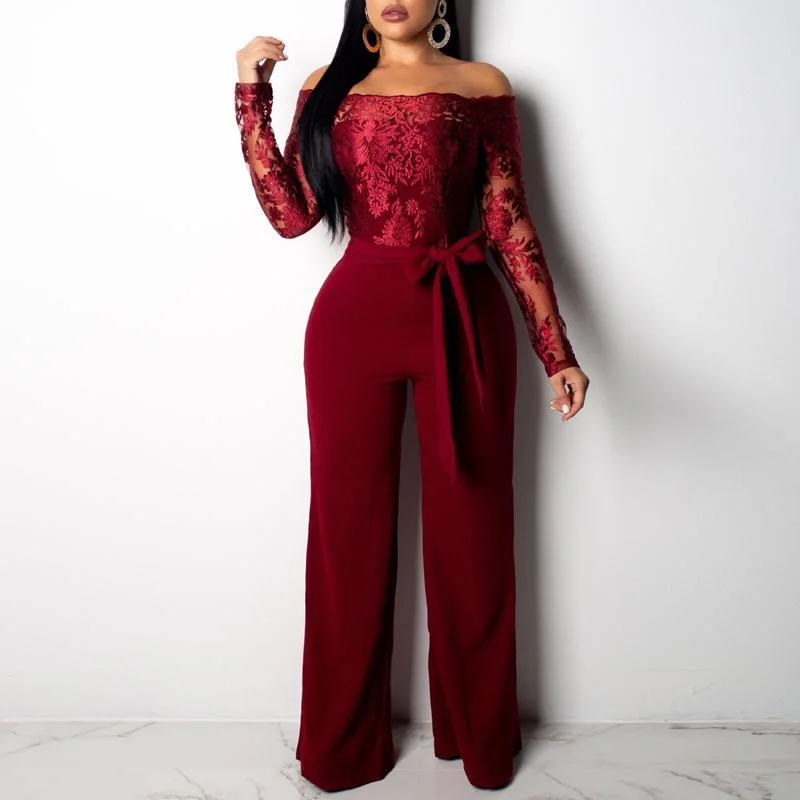 Solid Off Shoulder Lace Patchwork Tied Jumpsuit