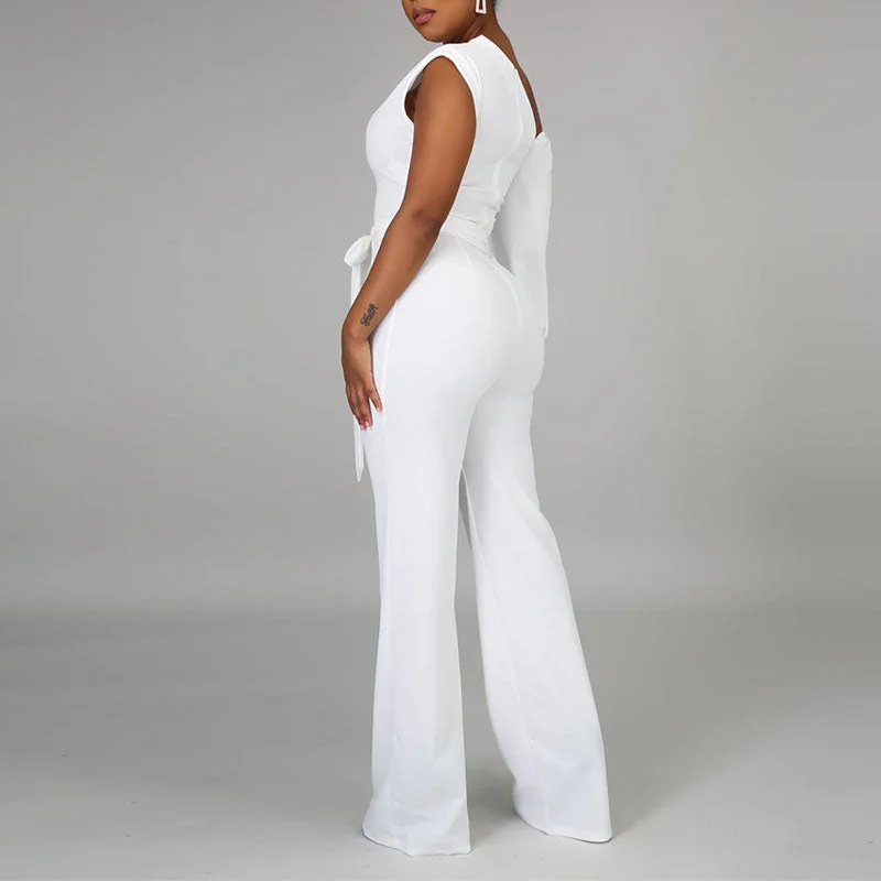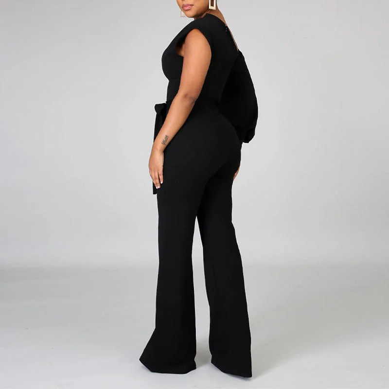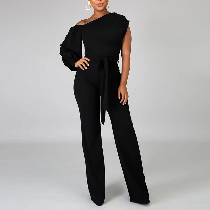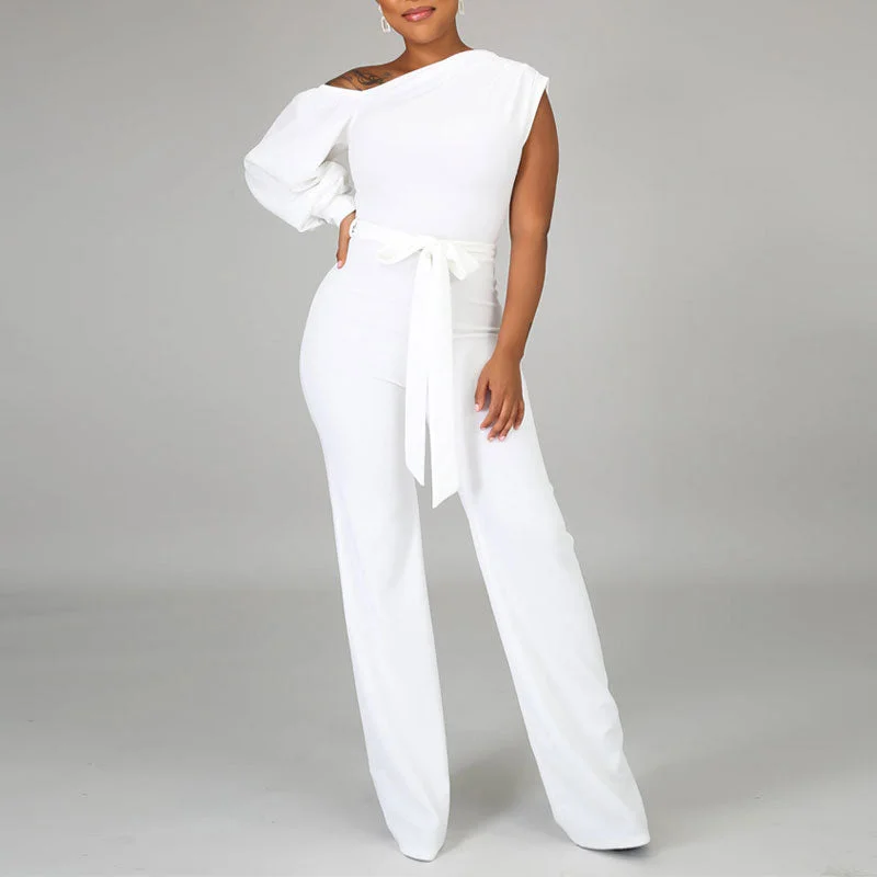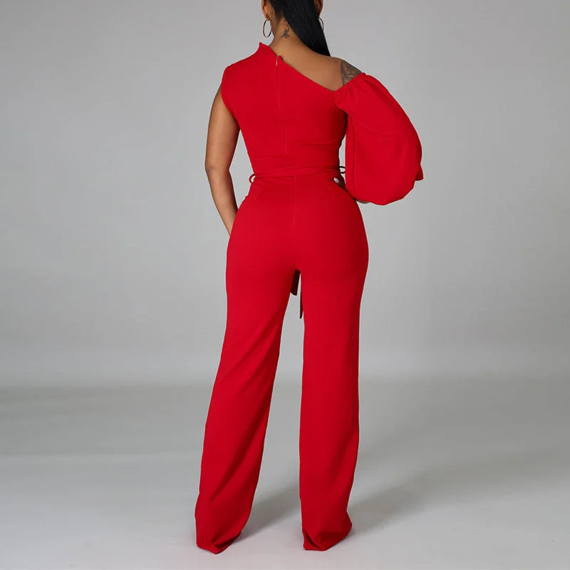 Solid One Shoulder Belted Wide Leg Jumpsuit