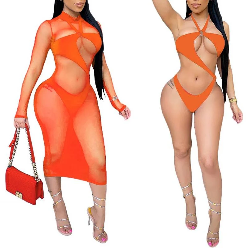 Solid Sheer Mesh Cover Up Two Piece Swimsuit Set