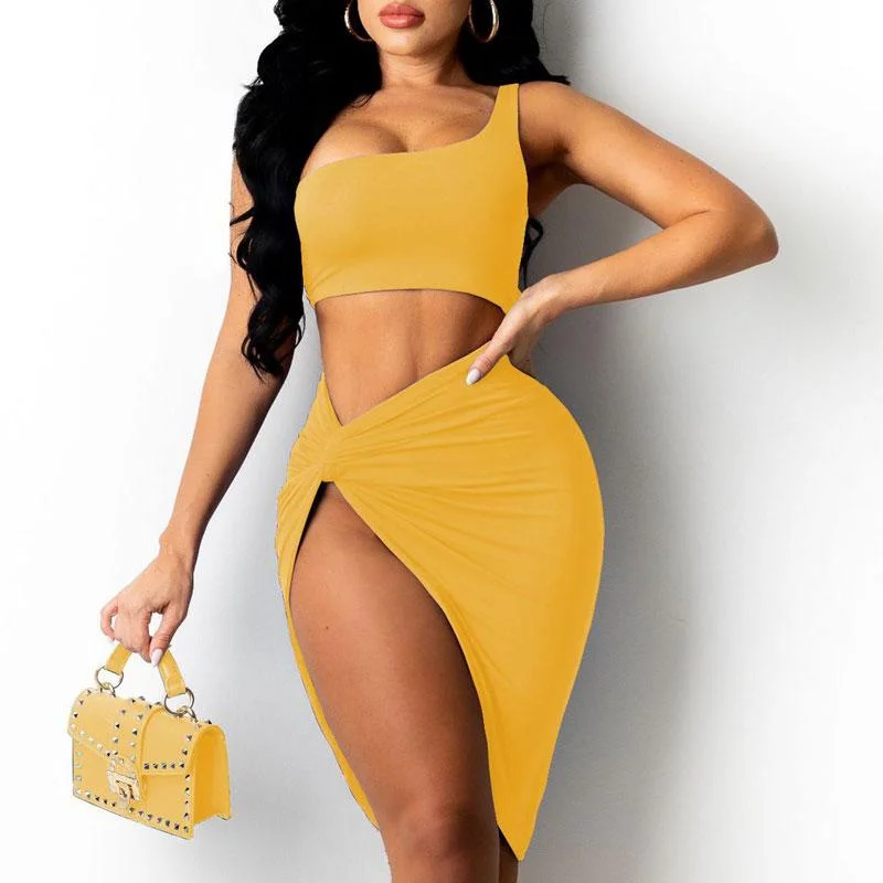 Solid Sleeveless One Shoulder Tube Top & Slit Skirt Set