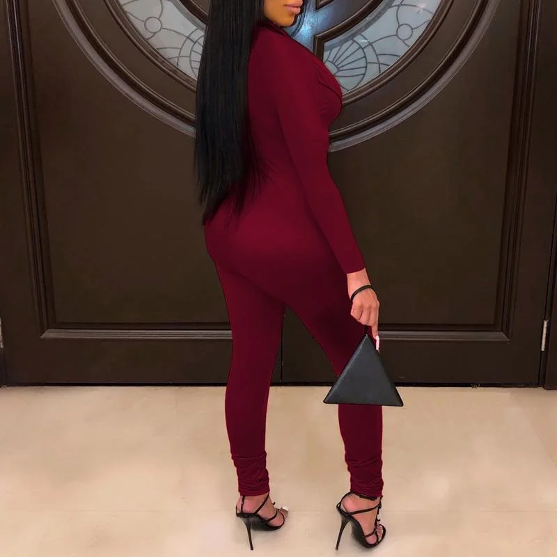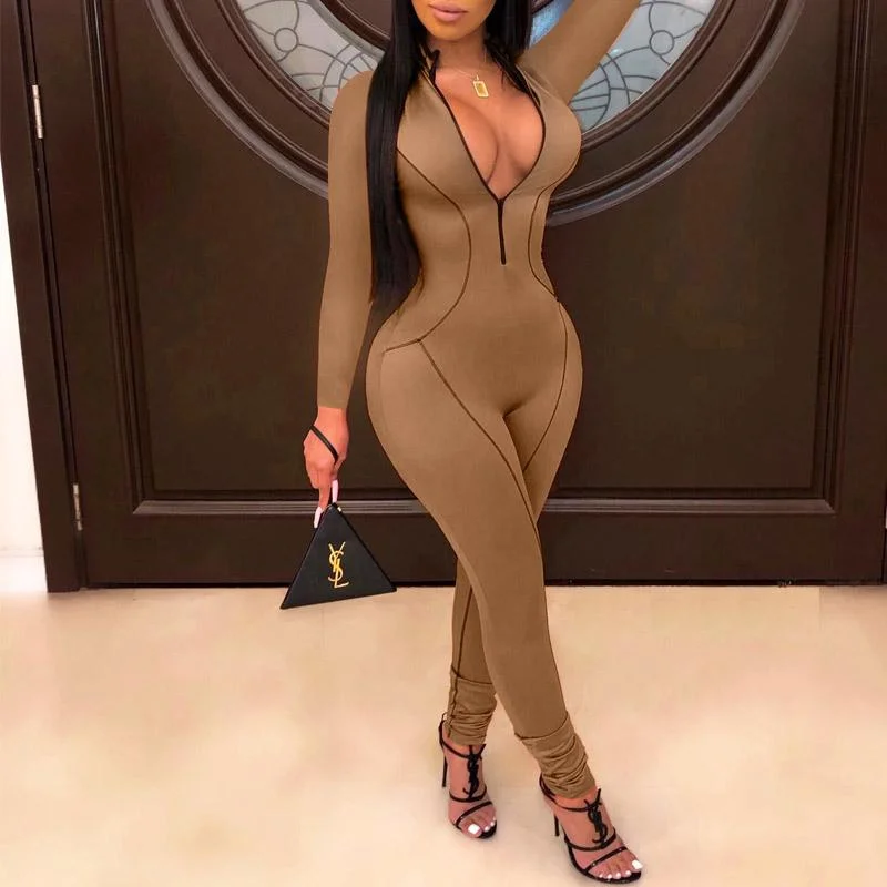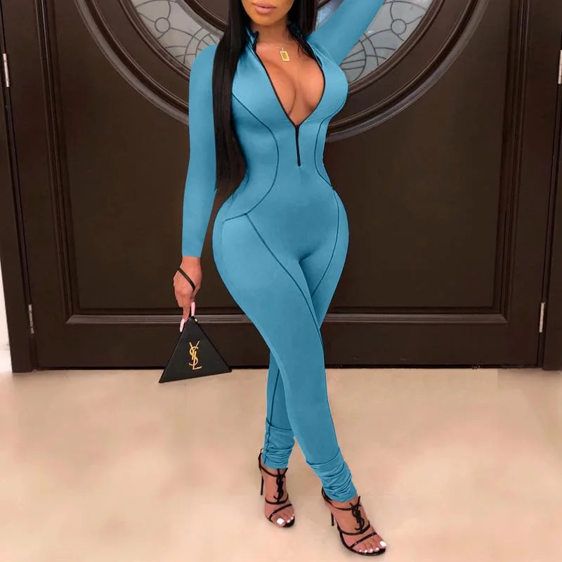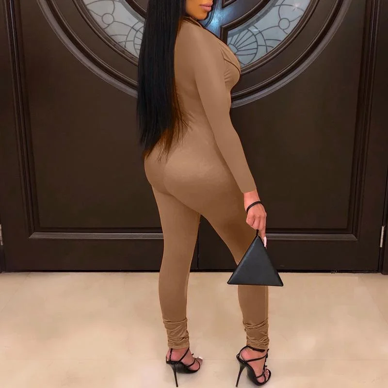 Solid Strip Zipper Design Long Sleeve Jumpsuit
