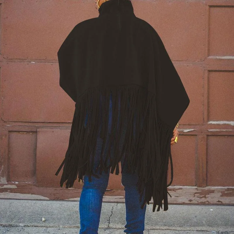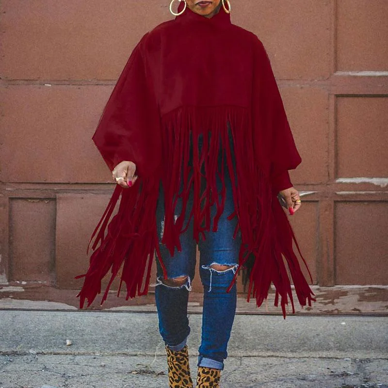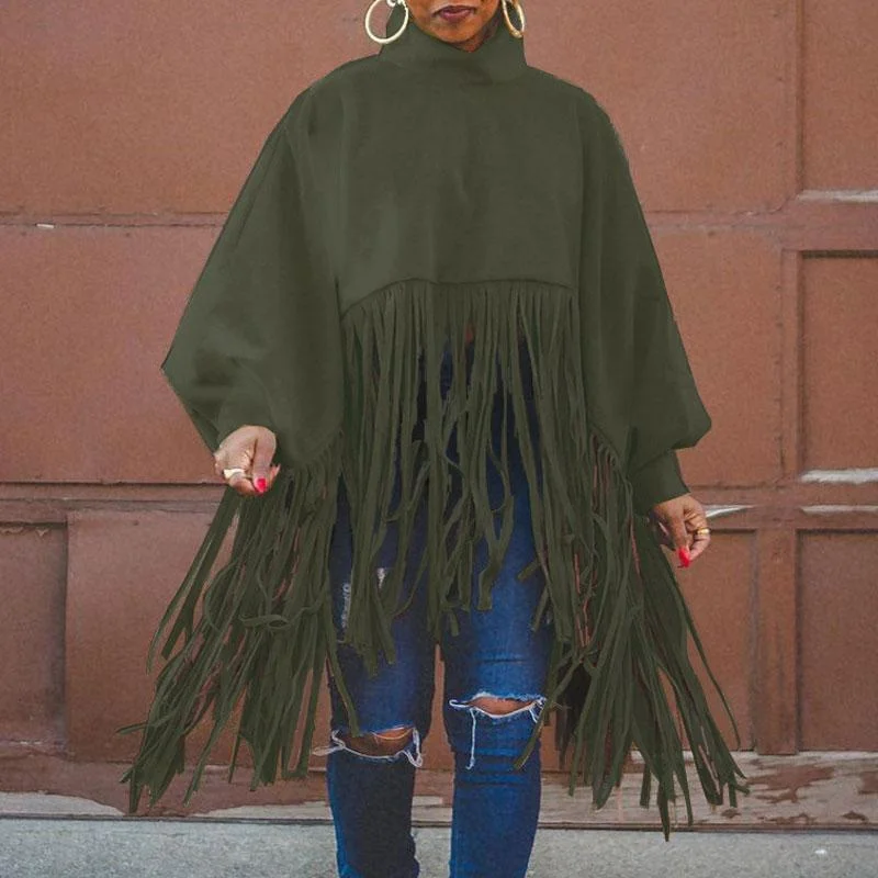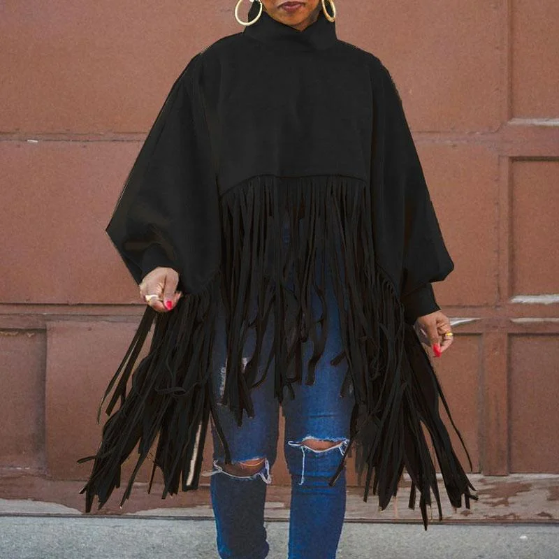 Solid Turtleneck Lantern Sleeve Tassel Design Plus Size Top
