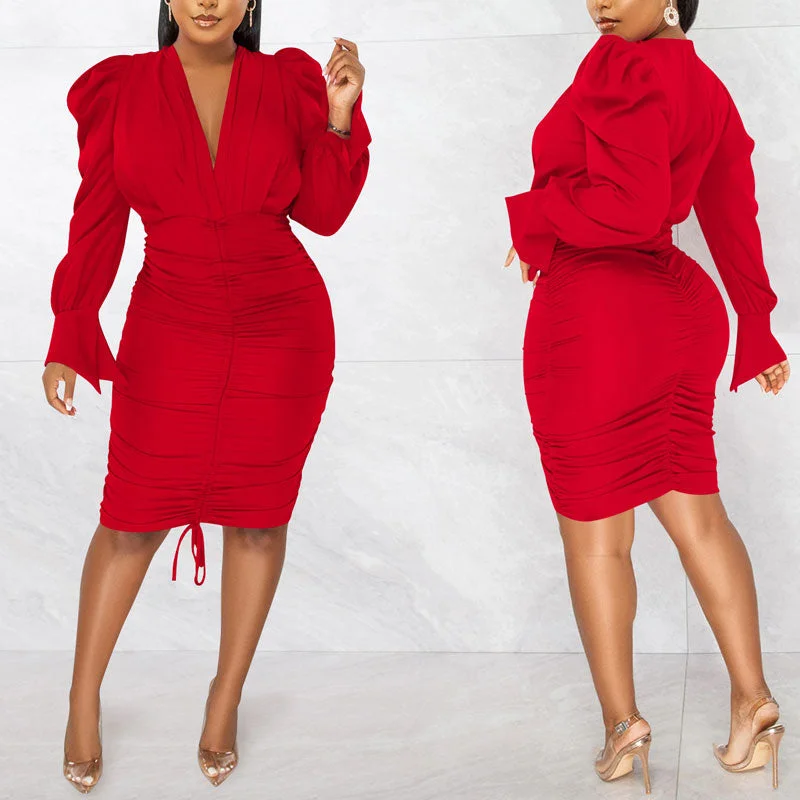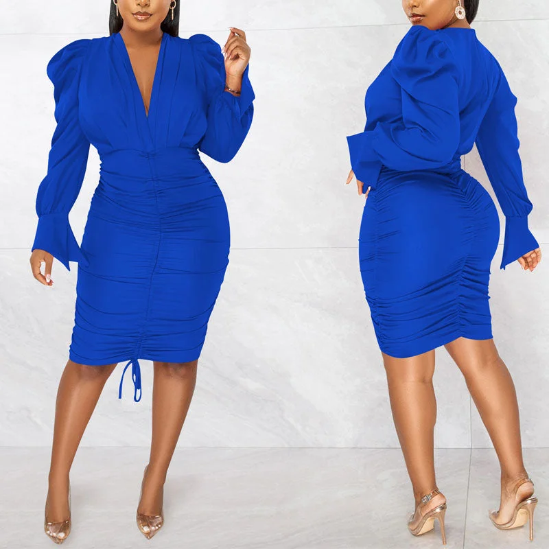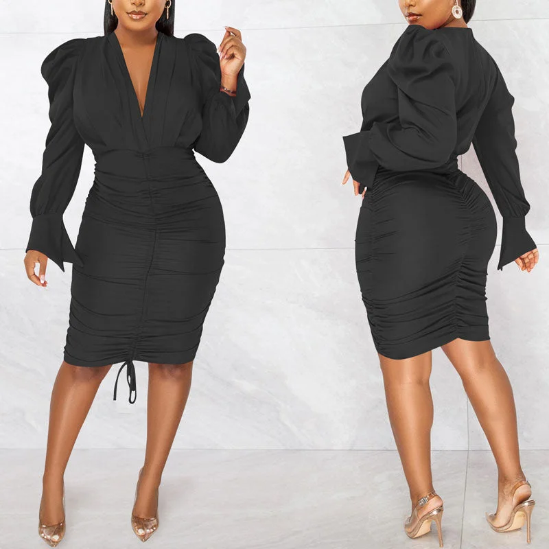 Solid V-Neck Puff Sleeve Ruched Bodycon Dress